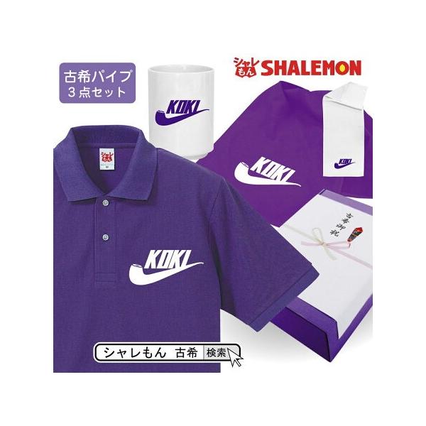 Amazon シャレもん 古希 お祝い プレゼント 父 母 紫 ポロシャツ スポーツブランド風パイプ3点セット 古希祝い 70歳 誕生日 おもしろ 記念品 ポロシャツ 通販